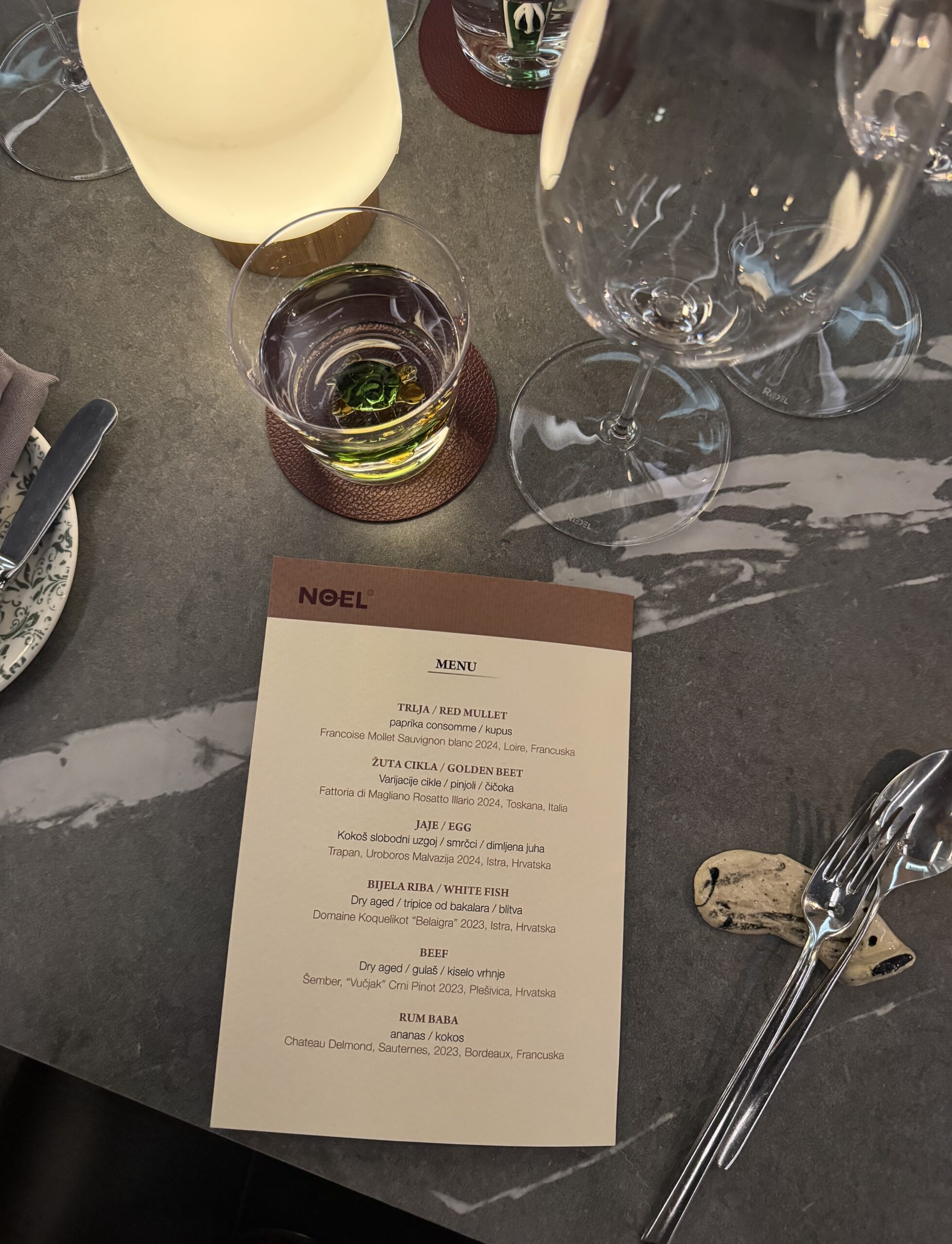 Vinsku priču vodio je Kristijan Harja, trostruki najbolji sommelier Hrvatske, koji je slijedove pratio pažljivo odabranim etiketama iz Francuske, Italije i Hrvatske. Od svježeg Sauvignon Blanca iz Loire, preko roséa iz Toskane i istarske malvazije, do elegantnog crnog pinota s Plešivice i završnog Sauternesa iz Bordeauxa, pairing je bio strukturiran, promišljen i u potpunom skladu s intenzitetom svakog slijeda.