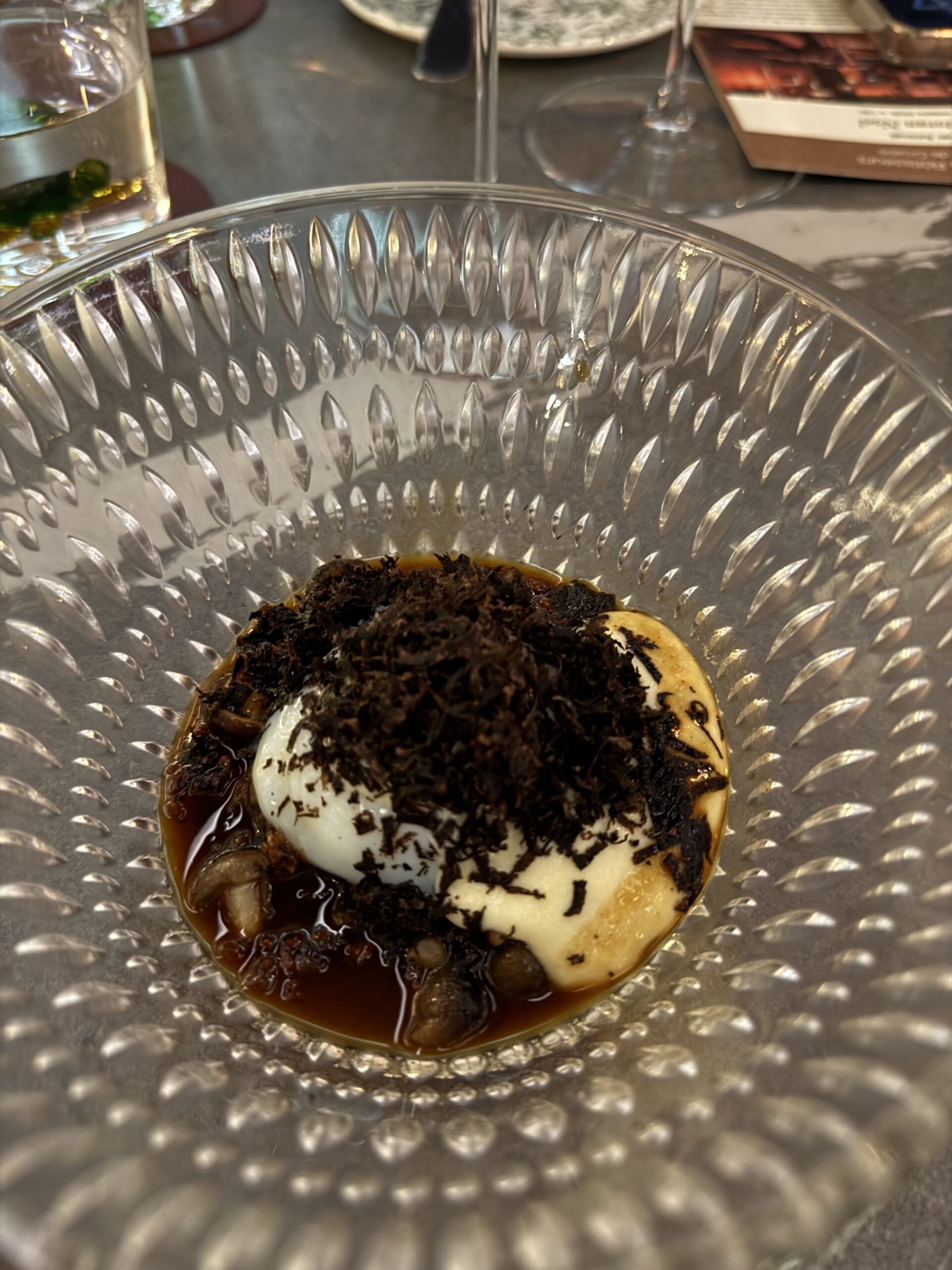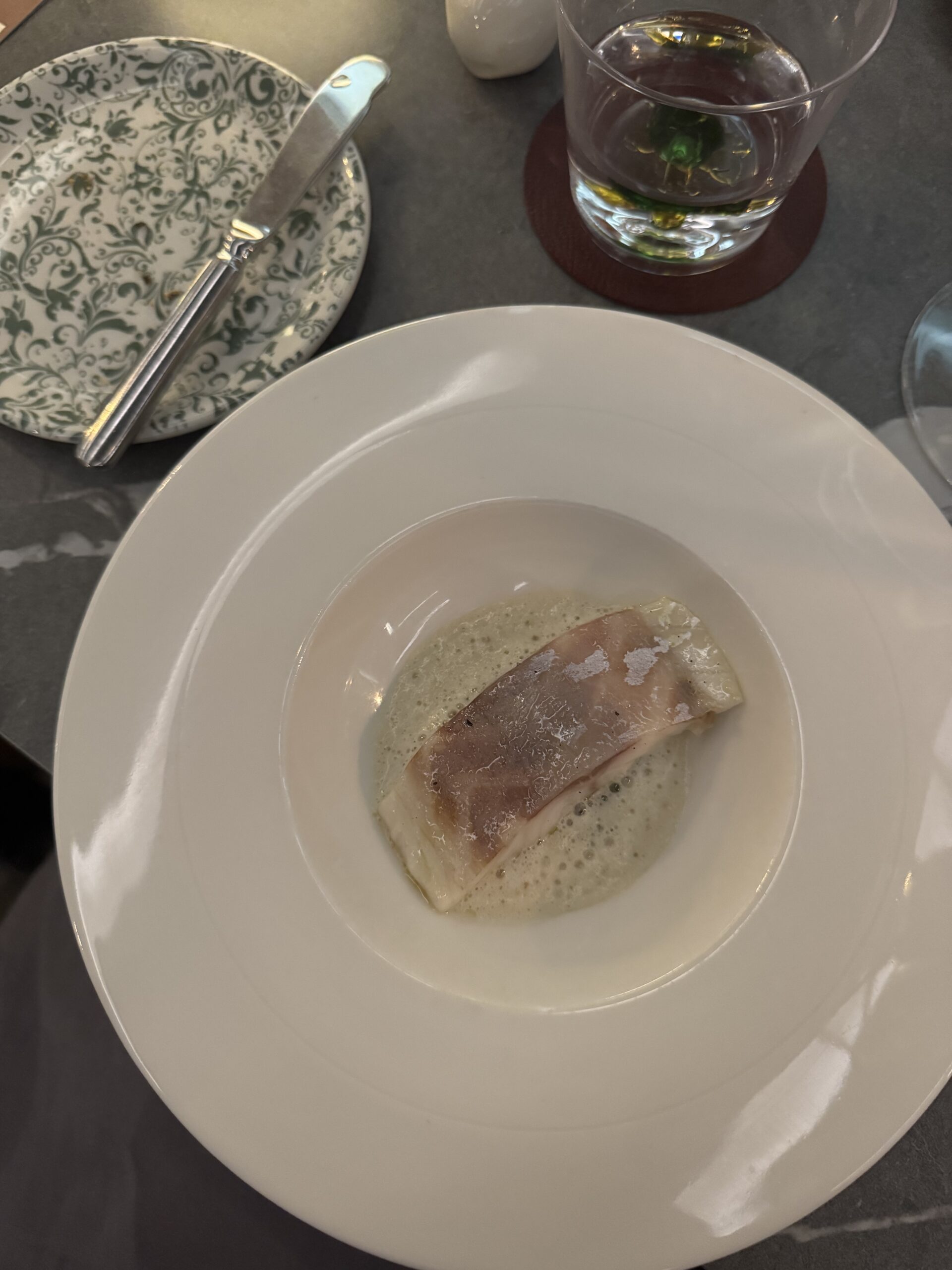 Meni je započeo gofom uz papriku, consomme i kupus, gdje su se intenzitet mora i aromatika povrća susreli u precizno izbalansiranom uvodu. Slijed žute cikle s pinjolima i čičokom naglasio je zemljane tonove i teksturalnu igru, dok je jaje s kokoši slobodnog uzgoja, gljivama i dimljenom juhom donijelo dubinu i toplinu.
